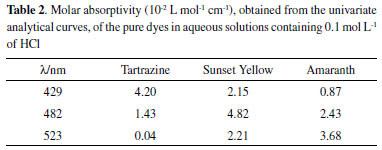 RESULTS AND DISCUSSION The individual absorption spectra of tartrazine, sunset yellow and amaranth, as well as the spectrum of a solution containing these three dyes, are shown in Figure 1. Students will find that the maximum absorbance for tartrazine, sunset yellow and amaranth occurs at 429, 482 and 523 nm, respectively. It can also be seen that the mixture spectrum is highly overlapped, particularly at the wavelengths of 429 and 482 nm, where the molar absorptivity of all dyes is about of the same order of magnitude (see Table 2). At 523 nm, absorptions of sunset yellow and amaranth are both significant. Therefore, quantitative analysis by the single-equation approach of the Beer-Lambert law cannot be satisfactorily applied to this system. For that reason, the SE and CLS methods were proposed.