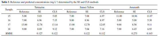 The absorption spectra were recorded over the 400-620 nm range using a 0.1 mol L-1 HCl solution as blank. All measurements were performed in a UV-Vis spectrophotometer (Cary 50, Varian) equipped with a 1.0 cm quartz cell. Data analysis For CLS analysis, the recorded absorbances of the eighteen samples are arranged in a matrix having 18 rows (number of samples) and 221 columns (number of variables). Those samples were further separated into two sets. The first 14 samples were selected to be the calibration set. These samples were employed to set up the CLS model. The remaining 4 were used for external validation (validation set). The basic CLS theory is presented in the Supporting Information as well as the steps for the development of the model using GNU Octave (or MATLAB). The procedure to perform the SE calculations using GNU Octave (or MATLAB) is also described in detail in the Supporting Information. First, the students need to determinate the wavelength of maximum absorbance for each food dye (λmax) using the pure spectra of tartrazine, sunset yellow and amaranth. Then, the molar absorptivity can be determined using Beer-Lambert plots. Finally, the students can solve the equations to calculate the concentration of each food dye within the mixtures. The predictive ability of each method and for each constituent was assessed in terms of the root-mean-square error (RMSE) of the validation set: ![]() In the above equation,