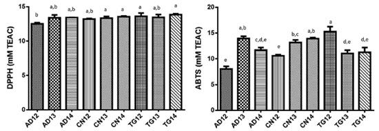 ![]() Figure 1. In vitro antioxidant activity evaluated by the capture of free radicals DPPH and ABTS of Merlot wines from Água Doce (AD), Campos Novos (CN) and Tangará (TG) regions, 2012 (12), 2013 (13) and 2014 (14) harvests