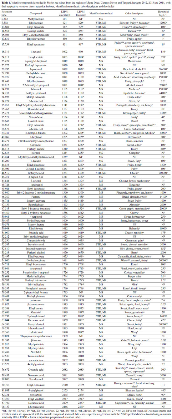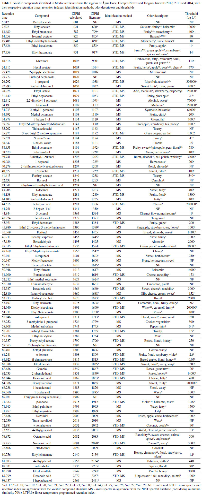 EXPERIMENTAL Reagents and solutions The analytical standards of the volatile and phenolic compounds studied were obtained from Sigma-Aldrich (St. Louis, MO, USA), with a purity equal to or greater than 98%: ethyl acetate (141-78-6), ethyl butanoate (105-54-4), ethyl pentanoate (539-82-2), ethyl hexanoate (123-66-0), ethyl heptanoate (106-30-9), ethyl octanoate (106-32-1), ethyl nonanoate (123-29-5), ethyl decanoate (110-38-3), ethyl undecanoate (627-90-7), ethyl dodecanoate (106-33-2), diethyl succinate (123,25-1), ethyl lactate (97-64-3), ethyl cinnamate (103-36-6), ethyl anthranilate (87-25-2), ethyl isobutanoate (97-62-1), ethyl 3-hydroxybutanoate (5405-41-4), ethyl isovalerate (108-64-5), ethyl 2-methylbutanoate (7452-79-1), phenylethyl acetate (103-45-70, hexyl acetate (142-92-7), S-furfuryl thioacetate (13678-68-7), furfuryl acetate (623-17-6), isobutyl acetate (110-19-0), isoamyl acetate (123-92-2), 3-methyl-1-butanol (123-51-3), methanol (67-56-1), 1-butanol (71-36-3), 2-butanol (78-92-2), 1-propanol (71-23-8), 2-phenyletanol (60-12-8), 1-hexanol (111-27-3), furfuryl alcohol (98-00-0), propanoic acid (79-09-4), butanoic acid (107-92-6), valeric acid (109-52-4), hexanoic acid (142-62-1), heptanoic acid (111-14-8), octanoic acid (124-07-2), pelargonic acid (112-05-0), decanoic acid (334-48-5), undecanoic acid (112-37-8), 10-undecenoic acid (112-38-9), isobutyric acid (79-31-2), isovaleric acid (503-74-2), α-pinene (7785-70-8), β-pinene (19902-08-0), geraniol (106-24-1), α-terpineol (98-55-5), limonene (5989-27-5), citronelal (2385-77-5), cedrene (469-61-4), γ-nonalactone (104-61-0), β-damascenone (23696-85-7), α-ionone (127-41-3), β-ionone (14901-07-6), nonanoic acid (112-05-0), β-terpineol (138-87-4), ethyl propanoate (105-37-3), caffeic acid (331-39-5), p-coumaric acid (501-98-4), ferulic acid (1135-24-6), vanillic acid (121-34-6), syringic acid (530-57-4), protocatechuic acid (99-50-3), gallic acid (149-91-7), quercetin (6151-25-3), kaempferol (520-18-3), (+)-catechin (154-23-4), (-)-epicatechin (490-46-0), tyrosol (501-94-0), trans-resveratrol (501-36-0). The internal standard used was 4-methyl-2-pentanol, and a mixture of C8-C20 hydrocarbons was obtained from Sigma-Aldrich. Ethanol, methanol, acetonitrile, acetic acid and sodium chloride were purchased from Synth (Diadema, SP, Brazil). Ultrapure water was obtained from a Milli-Q purification system (Millipore, Bedford, MS, USA). For each compound studied, a stock solution at 100 mg L-1 was prepared in 50% ethanol and stored at 4 °C. Standard solutions were prepared in synthetic wine (5 g L-1 tartaric acid, 11% ethanol, pH 3.5). Samples Nine samples of Merlot red wines, prepared by microvinification, were included in this study. Wines from 2012, 2013 and 2014 harvests in three different growing regions in Santa Catarina State, Brazil, were analyzed. The grapes were collected when reached technological maturity (total soluble solids ≈ 22 ºBrix, titratable acidity ≈ 0.60 mg tartaric acid. 100 g-1; pH ≈ 3.4; maturity index ≈ 40), from vineyards located in experimental areas managed by Epagri: Campos Novos Experimental Station, Campos Novos (altitude of 965 meters, latitude 27°19'83"S and longitude 50°49'18"W); Winery Pisani, located in Marari, Tangará (altitude of 1059 meters, latitude 27º12'24"S and longitude 51º06'96"W); and Winery Villaggio Grando, Água Doce (altitude of 1300 meters, latitude 26º43'53"S and longitude 51º30'26"W). Merlot grapes were harvested when mature and transported to the Epagri Experimental Station of Videira, Santa Catarina State. The grapes were separated from the bunches and kept in a stainless steel tank (20 L). The maceration period was ten days, with two daily reruns. The must was separated from the solid parts and transferred to a stainless steel tank. Before starting the alcoholic fermentation, sulfite (10 mg L-1 free SO2) and strains of Saccharomyces cerevisiae PB2019 (Fermol Blanc, AEB Spa, Brescia, Italy) were added. The decarboxylation of malic acid by lactic acid bacteria occurred spontaneously, without the addition of inoculum. After the alcoholic fermentation, the wines were stabilized for 20 days at a temperature of 4 °C ± 1 °C, added to the free SO2 (40 mg L-1) and then bottled. Microvinifications were performed in duplicate. All samples were stored in a cellar at 18 ºC and 70% relative humidity until the analysis was carried out. Determination of volatile compounds Headspace Solid Phase Microextraction (HS-SPME) Sample prepare was carried out according to the methodology of Arcari et al.:11 a 1 cm divinylbenzene/carboxen/polydimethylsiloxane (DVB/CAR/PDMS) 50/30 µm fiber obtained from Supelco (Bellefonte, PA, USA) was used in the experiments after previous conditioning according to the manufacturer's recommendations. In each test, 1.5 g of NaCl and 5 mL of sample were placed in a 20 mL vial. The HS-SPME procedure was performed using a Triplus-RSH autosampler (Thermo Fisher Scientific, USA) and ChromQuest software (Thermo Fisher Scientific, USA). Samples were incubated for 5 min at 56 ºC under continuous agitation (250 rpm), and the fiber was then exposed to the headspace for 55 min. The desorption in the gas chromatograph injector was performed for 2 min at a temperature of 265 °C in the splitless mode. Identification and quantification of volatile compounds The volatile compounds were qualitatively determined using a gas chromatograph Varian CP-3800 (USA) GC-IT/MS equipped with an ion trap analyzer (Varian Saturn 4000, USA) and Saturn GC-IT/MS Workstation software, version 5.4. The ion trap detector was operated at temperatures of 200 °C in the transfer line, 50 °C in the manifold and 180 °C in the trap. All mass spectra were obtained by electron impact (70 eV), in the scan mode (25 - 400 m/z). The emission current was 50 µA, with a maximum ionization of 25000 μs. The chromatographic separation was performed using a ZB-WAXplus column (60 m x 0.25 mm 
