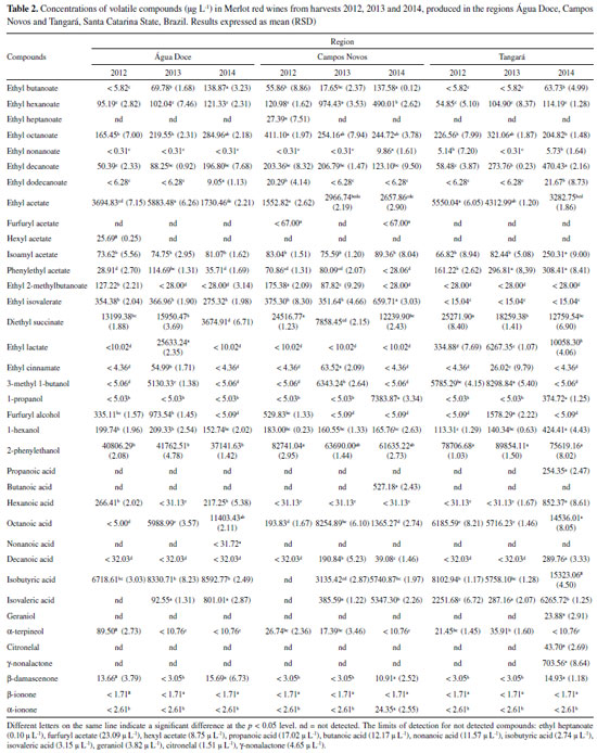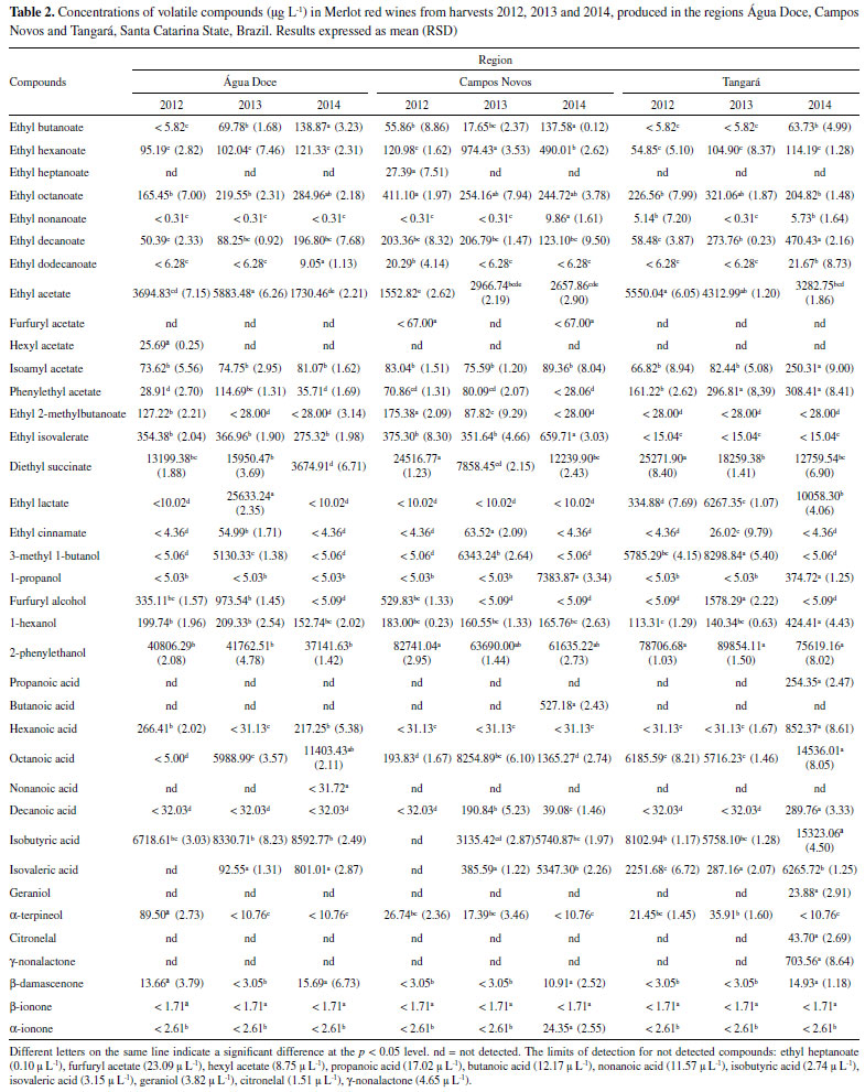 RESULTS AND DISCUSSION Volatile compounds profile of wines A total of 95 volatile compounds were identified in the Merlot red wine samples (Table 1), 38 of which were positively identified using commercial standards. The remaining compounds were tentatively identified based on the similarity (> 70%) between the mass spectra of the compounds in the sample and the NIST library, and by comparative analysis between the calculated retention indexes and the retention indexes available in the literature, in which the values reported for polar polyethylene glycol columns were considered. A maximum deviation of 30 units was observed between the experimental data and the retention index reported in the literature for the compounds isoamyl acetate, ethyl lactate, 2-hexen-1-ol and 3-octenol. Welke et al.29 obtained a maximum deviation of 33 units when comparing experimental retention indexes with those reported in the literature in a study on Brazilian Merlot wines from the Serra Gaúcha region. Only 19% of the compounds tentatively identified showed deviations greater than ten units when the retention indices were compared. Of the chemical groups found in the volatile fraction of the Merlot wines, the esters were present in the greatest number (40), followed by alcohols (25), acids (9), terpenes (8), aldehydes (3) and C13-norisoprenoids (3) , ketones (2) and phenols (2), methoxypyrazine (1), lactone (1) and sesquiterpene alcohol (1). The predominance of the volatile compounds belonging to the classes of esters, alcohols and acids was previously observed by Welke et al.29 and Jiang et al.7 in Merlot varietal wines. According to the data available in the literature,11,29,30 terpene borneol were reported for the first time in Brazilian Merlot wines. Borneol, which has a camphor odor, was previously detected in wines of the Fernão Pires cultivar in a study conducted by Rocha et al.31 Compounds such as borneol have been reported to have antifungical, pesticide, antibacterial and antioxidant activities, and contribute to the complexity of the wine's aroma, especially for spicy notes. It acts mainly through the mechanism of synergism with other compounds.31 Quantification of volatile compounds and odor activity value (OAV) The concentrations of the predominant volatiles found in the Merlot wine samples are shown in Table 2. The OAV (odor activity value) was used to determine which compounds could contribute to the aroma of the wines, since volatile compounds with OAV > 1 is indicative of a possible perception by the human nose.21 The class with the highest number of volatile compounds of importance for the aroma of the wines were esters. The ethyl esters of fatty acids found in the highest concentration in the samples analyzed were ethyl hexanoate (54.85 - 974.43 μg L-1), ethyl octanoate (165.45 - 411.10 μg L-1) and ethyl decanoate (50.39 - 470.43 μg L-1). Analysis of variance (ANOVA) was applied to the experimental data considering two factors, region and harvest, and revealed that these factors influenced the content of ethyl esters of fatty acids (p < 0.05). Only the ethyl octanoate compound did not show a significant difference between the wines from different harvests. In general, a higher content of this class of esters was observed in the 2014 harvest (ethyl hexanoate being an exception). The final concentration of ethyl esters of fatty acids in wines is dependent on the reactions that occur during alcoholic fermentation, culminating in the formation, volatilization and hydrolysis of the esters. Ethyl hexanoate, for example, is derived from the modification of C6 compounds by yeast and its production is dependent on the yeast cell growth rate, which varies according to both the yeast strain and the conditions of the fermentation medium. Also, the concentration of esters in wine is regulated by the ability to release the ethyl esters through the yeast cell membrane. Only 8 to 17% of the long chain esters present, such as ethyl decanoate, are released into the wine during alcoholic fermentation and therefore their content is usually lower than that of short chain esters.22 Ethyl hexanoate presented the highest OAV (3.92 - 69.6), contributing to the aromas of green apple, strawberry and spices8,18,19,22 primarily in the case of the wines from Campos Novos. For ethyl decanoate, which has a fruity grape aroma,21 the OAV ranged from 0.25 to 1.85, and it was notably present in the Tangará wines. Ethyl octanoate presented OAV < 1 for all samples analyzed and, therefore, it does not contribute significantly to the aroma of the samples.