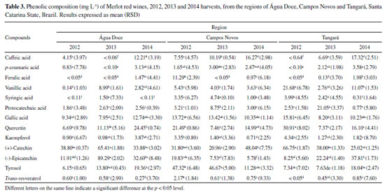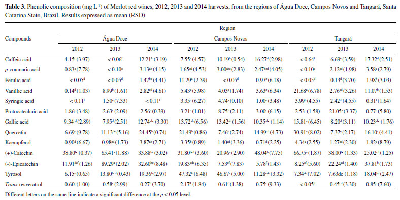 CONCLUSIONS This is an initial study about the phenolic composition, volatile profile and in vitro antioxidant activity of Merlot wines produced in three new wine-growing regions of Santa Catarina (Brazil) using spectrophotometry, GC-MS and HPLC-DAD methods. Differences between the wines produced with the same grape variety but from different geographic regions and harvests were evident, in terms of volatile compounds, phenolic compounds and antioxidant activity. Positive correlations were observed between the content of quantified phenolic compounds, especially syringic acid and vanillic acid, and the in vitro antioxidant activity observed in wines. High concentrations of hydroxycinnamic acids are characteristic of wines produced in the Tangará region, as well as high antioxidant activity in vitro. High concentrations of phenylethyl acetate, ethyl cinnamate and γ-nonalactone, which contribute to the aromas of red fruits, coconut, peach, roses and honey, were also observed in the wines of this region. For the Campos Novos region, high concentrations of trans-resveratrol, tyrosol, flavonols and hydroxycinnamic acids were observed, as well as the esters ethyl isovalerate, ethyl 2-methylbutanoate and ethyl hexanoate, which present the aroma attributes of sweet fruits, strawberries, apples and spices. On the other hand, for the Água Doce region, it was not possible to clearly define the main chemical constituents of the wines analyzed, evidencing the importance of conducting further studies on Merlot wines produced in this region. All of the samples analyzed presented a considerable content of fatty acids, which at high concentrations contribute unpleasant odors to the wines. In this regard, further studies should be carried out in order to understand why the synthesis of fatty acids is accentuated during the elaboration of wines from these three new wine-growing regions. In conclusion, environmental factors play an important role in the quality of the wines evaluated and influence the chemical composition in terms of volatile and non-volatile compounds.