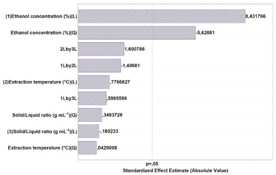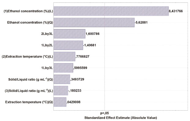 The Pareto chart (Figure 1) allows for a clearer view on the effects of the evaluated variables.22 The diagram shows that only ethanol concentration (L and Q) had a statistically significant effect on the phenolic compounds extraction. The interaction effects between variables and the quadratic and linear effects of extraction temperature and solid-liquid ratio was not relevant on TPC evaluation.