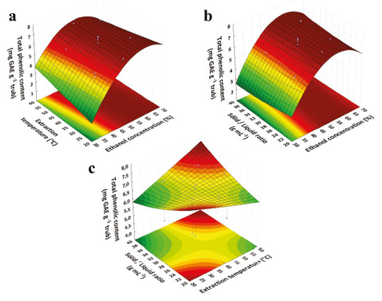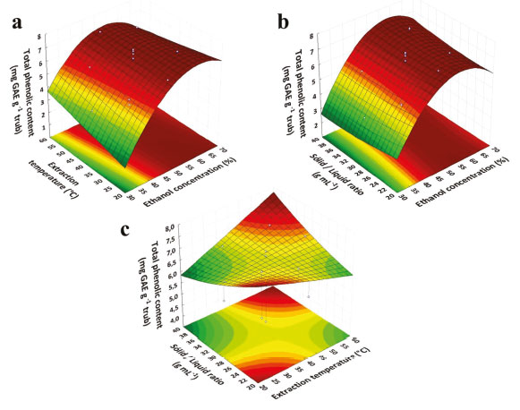 Effect of independent variables on TPC on RSM model Response surface method was applied to determine the variables optimal levels on trub's phenolics extraction, thus, tridimensional surface plots were constructed, according to Equation 2. The results are shown in Figure 2. Figure 2a shows the effect of ethanol concentration and extraction temperature on TPC. TPC increased gradually, along with ethanol concentration at a given temperature of extraction, reaching maximum values between 55 and 66%. However, when ethanol concentration was higher than 66% in the present investigation, the phenolic content slowly decreased.