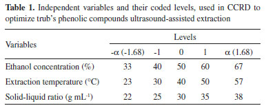 The frequency and duration of the extracting process was fixed at 37 kHz, for 30 min. After extraction, the solution was centrifuged (Hermle, model Z200A, Gosheim, Germany) for 25 min at 1956 g. Supernatant was removed and filtered through Whatman Nº 1 filter paper under vacuum, with the obtained solution being used in the total phenolic content determination. Experimental design An experimental design was conducted to optimize trub's phenolic compounds extraction based on the ultrasound-assisted technique, adapting Wang et al.18 and He et al.19 propositions. Central composite rotatable design (CCRD) was employed to evaluate the effects and interactions of three extraction variables, allowing to determine which combination was the best to extract trub's phenolics. These independent variables were ethanol concentration (x1), extraction temperature (x2) and solid-liquid ratio (x3), coded in different levels (-1 and +1) with a central point (0) and two axial points (-1,68 and +1,68), as shown in Table 1. This strategy was based on a 23 factorial design with eight factorial points, six axial points and four center point replications, allowing for the estimation of experimental error, leading to 18 sets of experiments. Table 2 lists the actual experimental parameters corresponding to the designed levels. All assays were performed in random order and in triplicate to minimize unexpected variability effects on the observed responses. Response variables were fitted to a second order polynomial model equation (Equation 1), applying response surface methodology (RSM), which was able to describe the relationship between responses and independent variables, providing an ideal model for total phenolic contents (TPC) extraction. ![]() In the model, Y represents the predicted response, β0 the constant, βi the quadratic linear regression coefficients, βii and βij the linear regression interaction coefficients, xi and xj the independent variables and i and j the system's coded factors. All coefficients were calculated by regression analysis and their significance was verified using analysis of variance (ANOVA) on STATISTICA 7.0 (Statsoft Inc., Tulsa, OK, USA) statistic software. Determination of TPC in trub's extracts Trub extract's TPC was determined with Folin-Ciocalteu method.20 In this technique, 150 µL of trub extract solution was added to a test tube and mixed with 7500 µL of distilled water and 750 µL of Folin-Ciocalteau. After three minutes, 2250 µL of sodium carbonate solution (15% Na2CO3) and 4350 µL of distilled water were added and the mixture, which was then shaken and left to decant at room temperature for two hours, in the dark. The absorbance of the resulting solutions was evaluated at 765 nm using a SP 2000 spectrophotometer (Bel Photonics®, Piracicaba, SP, Brazil). Extract's TPC was expressed as a gallic acid equivalent (mg GAE g-1 trub). Statistical analysis All experiments were carried out in triplicates and its results were expressed as the mean ± standard deviation (SD). Response surface plots were obtained through STATISTICA 7.0 statistical software (StatSoft, Inc., Tulsa, OK, USA). Data was submitted to both regression and variance analysis (ANOVA) (p < 0.05).