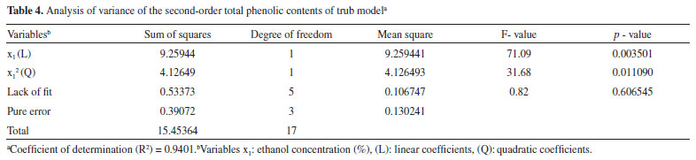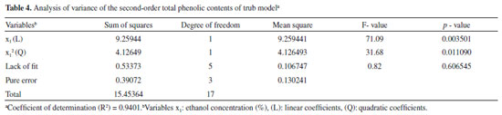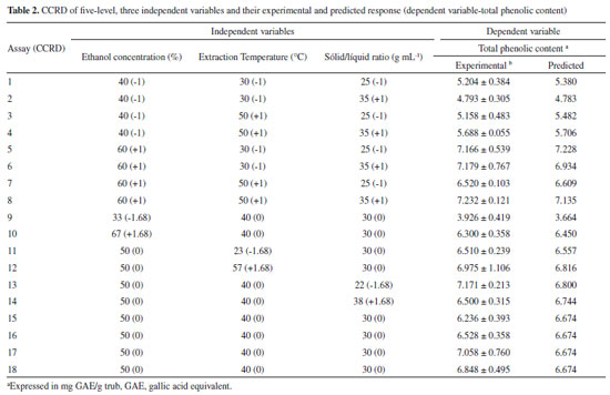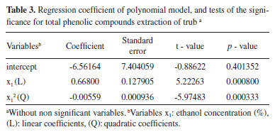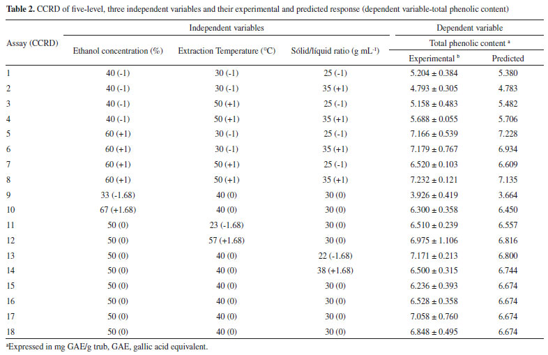 RESULTS AND DISCUSSION Determination of total phenolic content (TPC) in trub extracts Central composite rotatable design 23 (factorial planning) was applied, along with response surface methodology, to optimize the trub's TPC extraction and evaluate the main effects and study factor interactions. The evaluated factors were ethanol concentration (33-67%), extraction temperature (23-57 °C) and solid-liquid ratio (22-38 g mL-1). Table 2 shows the matrix (CCRD) with the coded and real values, as well as the responses obtained for 18 trials, with the experimental and predicted values of total content of phenolic compounds extracted from trub. The predicted values of total phenolic content are close to the experimental values, demonstrating that the model is applicable. The maximum phenolic compounds content (7.232 mg GAE g-1 trub) was obtained during test number eight, under 60% ethanol concentration, 50 °C extraction temperature and 35 g mL-1 solid-liquid ratio, at a fixed extraction time of 30 min. Lowest phenolic compounds content (3.926 mg GAE g-1 trub) was obtained during experiment number nine. Multiple regression analysis was performed on the experimental data and the model coefficients were evaluated for significance, using Student's t-test. The quadratic (Q) and linear (L) effect of ethanol concentration was significant (p < 0.05), however, the effects of extraction temperature (L) (Q) and solid-liquid ratio (L) (Q), as well as the interaction effects between variables were not significant in this study. Coefficient values are presented in Table 3.