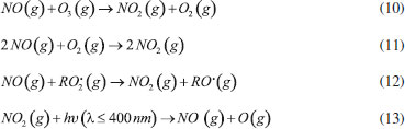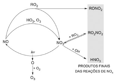 ![]() Figura 4. Reações de interconversão dos óxidos de nitrogênio NO e NO2 e os produtos finais resultantes dos processos de remoção do NOx atmosférico. Adaptado e reproduzido com a permissão de Perring e colaboradores.65 Copyright 2013 American Chemical Society