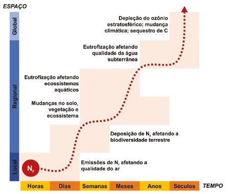 ![]() Figura 1. Representação esquemática da cascata de nitrogênio demonstrando como os efeitos de um único átomo de Nr se amplificam no tempo e espaço. Adaptado de Erisman 201521 e reproduzido com permissão do autor