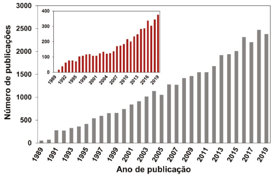 ![]() Figura 2. Trabalhos científicos publicados nos últimos 30 anos relacionadas ao tema "atmospheric aerosol" (de 1989 a 2019). Inserção: Trabalhos científicos relacionados ao tema "nitrogen aerossol" publicados no mesmo período. Levantamento bibliográfico realizado em 01 de abril de 2020 utilizando a base de dados Web of Science