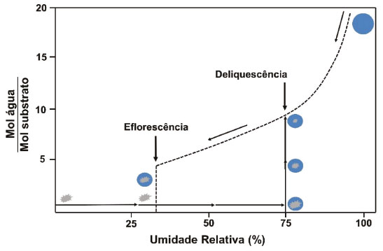 ![]() Figura 3. Representação esquemática dos processos de absorção e perda de água por uma partícula de sal de sulfato de amônio, demonstrando como o tamanho da partícula varia de acordo com a sua composição (que determina os pontos de deliquescência e eflorescência) e com a umidade relativa do ar (disponibilidade de água na atmosfera). Adaptado de Reid 200351 e reproduzido com a permissão de The Royal Society of Chemistry
