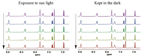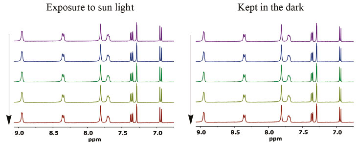 ![]() Figure 1. 1H-NMR of MgPhenIso in buffer solution at pH 7.4 monitored as a function of time: 0 (violet), 24 (blue), 48 (green), 72 (olive) and 120 (brown) h