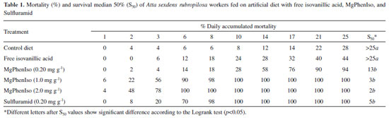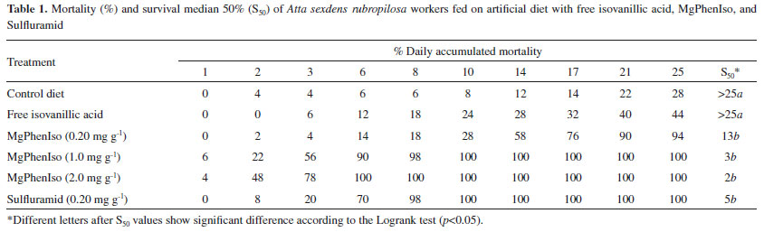 A systematic knowledge on the solubility of the potential pesticide is important to the agroindustry, since highly soluble pesticides can contaminate ground water and cause damage to the aquatic environment.32 The solubility of the MgPhenIso complex is much higher (314.13 ± 2.13 µg mL-1) than that of the free isovanillic acid (80.12 ± 1.49 µg mL-1) in aqueous solution (pH 7.4) at 25 °C (298 K). In general, PFOS have solubility around 550 µg mL-1, which is higher than that of the complex.33 Based on this higher solubility, toxicity, and difficulty in rapid detection (for example, using UV-vis) associated with PFOS, the MgPhenIso complex has the advantage of being as soluble as PFOS, but less toxic and more easily detected using non-expensive techniques in case leak occurs. Insecticidal activity against Atta sexdens rubropilosa and its symbiotic fungus Leucoagaricus gongylophorus Table 1 shows the time-dependent toxicity data of leaf cutting worker ants (Atta sexdens rubropilosa) treated and fed on artificial diet (negative control group), sulfluramid (positive control group), free isovanillic acid, and MgPhenIso. The survival rates of the ants did not differ significantly between the negative control group and the group treated with free isovanillic acid. In contrast, the MgPhenIso group showed a markedly dose-dependent toxicity comparable to that of the commercial pesticide Sulfluramid, although it presented a delayed action mode and caused mortality faster than Sulfluramid (0.2 mg g-1, S50 = 5b in 10 days).