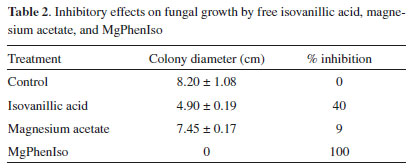 The studies were also extended to evaluate the effects of MgPhenIso and free isovanillic acid on the Leucoagaricus gongylophorus fungus. Table 2 shows the mean colony diameters in centimeters and the percentage inhibition of fungal development after 30 days of experiment. As shown in Figure 3, at 100 mg L-1, MgPhenIso suppressed all fungal growth.
