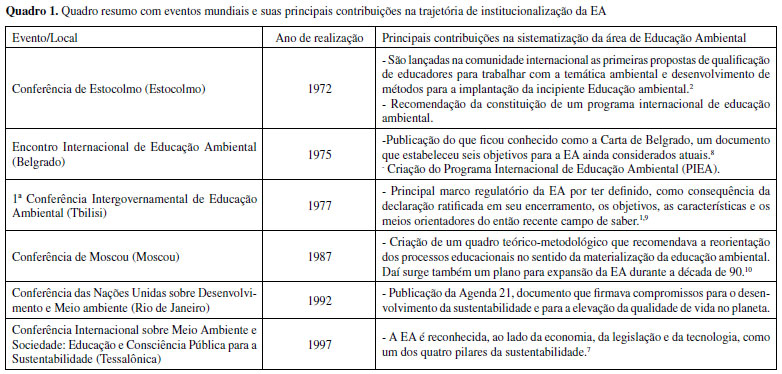 I. Secretaria de Estado de Educação de Goiás, 76350-000 Rubiataba - GO, Brasil Recebido em 27/05/2020 *e-mail: nyuara@ufg.br Environmental Education arises in the context of understanding the urgency of the environmental crisis and the need to seek answers for its mitigation. The different perspectives of AE compete for the affirmation of notions of the world, of society, of social well-being, of work and of life. The research investigated the conceptions of Environmental Education (EA) present in the scope of the Federal Institutes, having as corpus the Pedagogical Course Project (PPC) of teacher training courses in chemistry offered in these institutions in 23 states and in the Federal District. The documents were analyzed, in their entire body, with the aid of Textual Discursive Analysis (ATD). The results demonstrate the predominance of a conservative environmental education, of an apolitical and biologizing character, in the analyzed documents, what can be reflected in the profile of the chemical educator to be formed in these institutions. O SURGIMENTO DO CAMPO DA EDUCAÇÃO AMBIENTAL: CONJUNTURA INTERNACIONAL E O CONTEXTO BRASILEIRO O presente artigo traz reflexões teóricas e empíricas relacionadas ao contexto ambiental na formação de professores de Química no âmbito dos Institutos Federais (IF). Para o desenvolvimento das argumentações aqui tecidas, é importante refletirmos, incialmente, sobre a problemática ambiental tendo em vista suas vertentes teóricas e o cenário de estruturação desse campo de conhecimento. No sentido de esclarecer as diferenças entre alguns dos termos usados nesse texto, nos apropriamos da compreensão de Ribeiro e Cavassan, ao diferenciarem Natureza, Ambiente e Meio Ambiente. De acordo com os autores, a Natureza é a realidade dada, a qual existe independentemente da reação com o ser humano. O Ambiente refere-se à realidade apreendida, no que diz respeito à compreensão do ser humano sobre os fenômenos que o circundam. Já o Meio Ambiente traz imbricadas as relações de apropriação do homem sobre a natureza.1 O Meio Ambiente, compreendido, desde os primórdios da humanidade, como habitat e origem infindável de recursos, sempre refletiu as consequências do desenvolvimento de um modelo social insustentável. Alvo de agravos, da exploração e do descomedimento humano, o mundo natural não era questionado em sua capacidade de sustento da raça humana. Essa consciência só surge quando, ao final da primeira metade do século XX, o potencial destrutivo da ação antrópica sobre o meio ambiente se torna tão evidente que leva a humanidade a se questionar sobre sua própria sobrevivência.2 A prosperidade econômica e social nos anos que se seguiram ao pós-guerra, tidos como os anos dourados do capitalismo, fundamentada em um sistema de produção e um padrão consumista que compreendiam o ambiente natural como estoque infinito de matéria-prima, trouxe consigo a preocupação com a capacidade de manutenção do conforto e com a perspectiva de uma possível escassez dos recursos naturais.3 O modelo societário que compreende o desenvolvimento econômico como resposta para todos os problemas sociais, ao não enxergar seus efeitos no meio ambiente e ao não propor limites no uso desse e dos recursos dele advindos, foi responsável por incidentes de grande monta, que trazidos à tona pelas mídias de massa, despertaram nos indivíduos a preocupação com a segurança social. Desastres como a poluição do ar, em Londres, em 1952; a contaminação por mercúrio da baía de Minamata, no Japão, em 1954; os acidentes radioativos nas usinas de Three Miles Island, nos EUA, em 1979, são apontados como exemplos de catástrofes, com perda de vidas humanas, que lançaram os olhos da humanidade sobre a gravidade e a urgência da questão ambiental.2,4 Cabe ressaltar, ainda, o papel ambíguo da ciência no processo de construção do campo ambiental. Se, por um lado, é inegável que o sistema econômico baseado no consumo em larga escala foi, e é, impulsionado pelos avanços tecnológicos possibilitados pela Ciência, caracterizados como empreendimento tecnocientífico predatório, é igualmente certo que o desvelamento e o combate aos impactos gerados por esse sistema também são ensejados por ela.5 A publicação do livro Primavera Silenciosa, da americana Rachel Carson, no qual a autora denunciava os problemas decorrentes do uso do DDT, mostrou-se um importante marco para o questionamento sobre o papel do desenvolvimento científico na produção do desequilíbrio ambiental, evidenciando a necessidade de se olhar e discutir as questões ambientais no sentido da sobrevivência das gerações futuras.6 A necessidade de se discutir as questões relacionadas ao meio ambiente impulsiona a emergência da pauta ambiental em várias frentes. O termo 'Educação Ambiental' (EA) é utilizado pela primeira vez durante a Conferência de Educação da Universidade de Keele, realizada na Inglaterra no ano de 1965. Sua utilização se deu na discussão das possíveis contribuições da educação na transformação de comportamentos oriundos de uma herança cultural de degradação ambiental em práticas e valores orientados para uma cultura de zelo com o meio ambiente, principalmente através da inserção de conceitos de ecologia e de uma perspectiva preservacionista.7 De forma análoga ao surgimento do termo, a trajetória da institucionalização da EA é marcada por grandes eventos regionais e mundiais apresentados no Quadro 1.