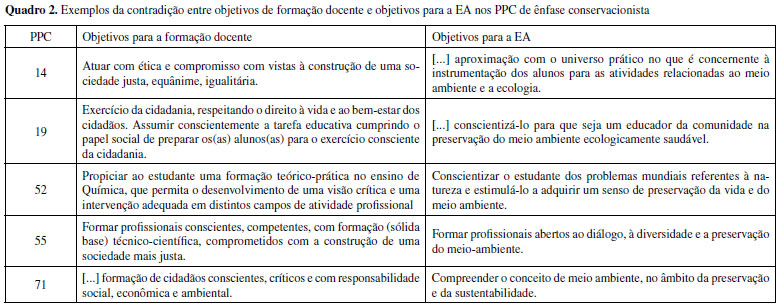 RESULTADOS E DISCUSSÃO No estudo dos 78 PPC que constituem o corpus dessa pesquisa, no que concerne a categoria concepções de EA impressas nos PPC, nos atentamos a duas unidades de análise: objetivos para a formação em EA e conteúdos programáticos nas ementas de disciplinas que discutem EA. A desmontagem dos textos nas referidas unidades nos levou a observar que 37 dos documentos evidenciam uma concepção Conservacionista de EA, enquanto 21 a entendem dentro de uma perspectiva Pragmática e apenas três explicitam uma ótica Crítica. Outros 17 desses documentos não trazem uma abordagem sobre objetivos ou concepções de EA. A seguir, discutiremos os dados da pesquisa à luz dos referenciais teóricos. A predominância de uma EA de caráter conservacionista Os PPC 02, 03, 04, 05, 06, 09, 10, 11, 12, 13, 14, 15, 16, 19, 22, 23, 24, 25, 26, 27, 29, 31, 32, 33, 39, 40, 45, 48, 52, 55, 56, 62, 70, 71, 72, 74 e 76, embora abordem a relação do ensino de Química e o respeito ao meio ambiente, ora entrevendo essa discussão em disciplinas de EA, ora diluindo-o entre as disciplinas de cunho específico e pedagógico, expressam esse vínculo dentro de um viés comportamentalista de transformação individual, como se a simples mudança nas atitudes dos sujeitos bastasse para a mitigação do cenário de crise socioambiental que vivenciamos. A discussão da crise ambiental fica reduzida, então, a propagação da lógica de um falso consenso sobre o modo de vida, que impõe a reprodução do modelo social hegemônico vigente como condição básica para a garantia universal de progresso e bem-estar, quando na verdade a supressão da crise ambiental que vivenciamos demanda uma ruptura com esse modelo, contemplando discussões e ações coletivas e não individuais. Excertos de alguns desses textos são apresentados no Quadro 2, em que evidenciamos o aspecto conservador das propostas de EA expressas nesses PPC por meio das contradições observadas entre os objetivos definidos para a formação docente e os objetivos para a EA. Salientamos que a escolha dos trechos apresentados no Quadro 2 deu-se a partir de recortes representativos que evidenciam construções semelhantes que se repetem nos documentos em termos da abordagem da temática ambiental.