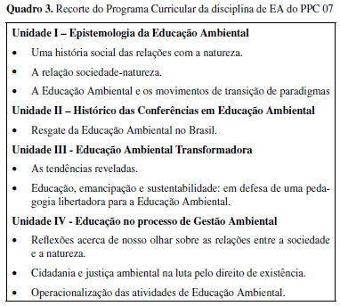 Nos excertos destacados observamos um apelo ao desenvolvimento de novos valores e de novas atitudes no trato com o meio ambiente e no uso dos recursos por ele oferecidos. Essas ideias remetem à lógica de consumo sustentável e de consciência ambiental cidadã, características da EA pragmática que, como apontam Layrargues e Lima, recorrendo ao bom-senso dos cidadãos, os convoca a renunciar parte de seu conforto em prol do que seria um bem maior.28 A EA como proposta de embate ao padrão de produção e consumo vigentes Apenas três dos PPC analisados apresentam objetivos para a EA que se aproximam da perspectiva crítica. Os PPC 07, 08 e 17 apresentam uma concepção da problemática ambiental em que se pode observar o inter-relacionamento entre questões de ordem social como causa e como fruto dos problemas inerentes ao meio ambiente, dentro de uma proposta de formação de um educador químico consciente da necessidade da mudança de paradigmas na sociedade em que nos encontramos inseridos e, além disso, sensível à incompatibilidade entre a luta pelo direito de condições socioambientais dignas e o modelo socioeconômico vigente. Tais ideias se relacionam à perspectiva crítica tendo em vista que a entendem como a contraposição às práticas de manutenção do status quo econômico, político e social da EA de ênfase conservacionista.24,30,41 Esses autores discutem a perspectiva crítica como a vertente que relaciona a problemática ambiental não unicamente aos conceitos ecológicos, mas sim aos seus múltiplos aspectos causais (políticos, econômicos, sociais, históricos, biológicos). Os PPC 07 e 08 trazem objetivos muito sintéticos para a EA, o que dificulta uma análise da compreensão dela dentro desses documentos. A ementa e programas das disciplinas que abordam a EA, por outro lado, deixam claro o trabalho e o entendimento da EA enquanto elemento na construção de uma compreensão da crise socioambiental como produto do padrão de produção e consumo predatórios e da necessidade urgente de sua transformação. O Programa Curricular da disciplina de Educação Ambiental do PPC 07 explicita essa perspectiva (Quadro 3):