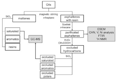 EXPERIMENTAL Asphaltenes separation and maltene fractionation from oil samples In this study, three biodegraded heavy oil samples, denoted A, B, and C, were used for an exploratory study of biodegradation effect on asphaltenes. The oils were provided by Petrobras (Rio de Janeiro, Brazil) and were obtained from offshore seeps located in the Brazilian continental margin. Additional information were given about the oils origin, being A and B lacustrine and C, marine. All the experimental procedures described below can be visualized in the Figure 1 scheme.