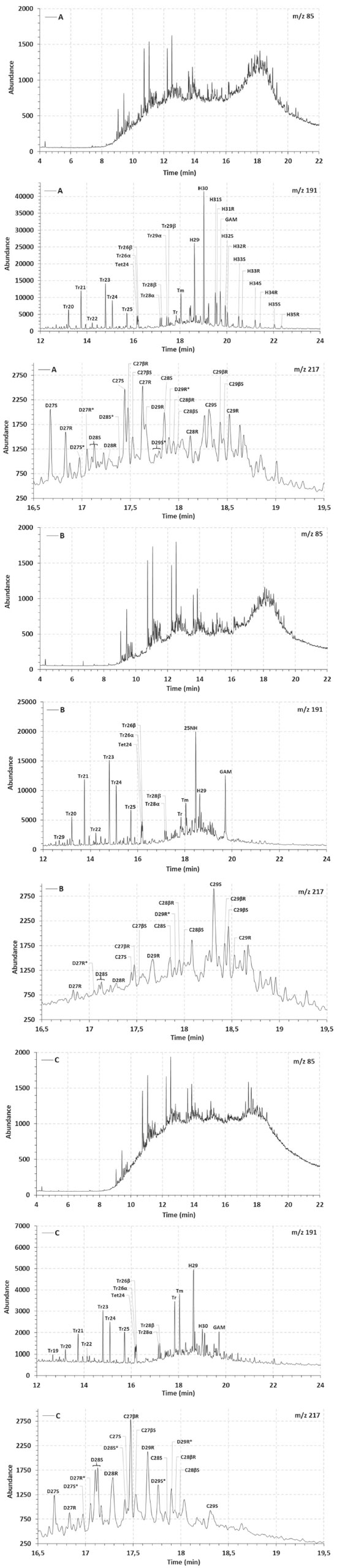![]() Figure 2. Linear alkanes (m/z 85), terpanes (m/z 191) and steranes (m/z 217) fragmentograms of the saturated fractions from oil samples A, B and C