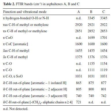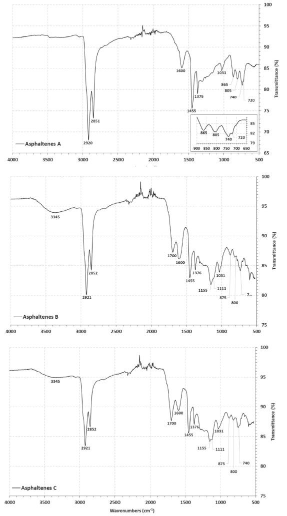 ![]() Figure 3. Infrared spectra (FTIR) of A, B and C asphaltenes