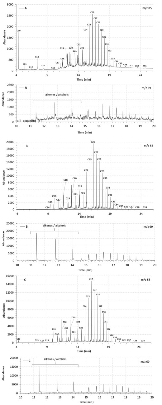 ![]() Figure 4. Linear alkanes (m/z 85) and m/z 69 fragmentograms of the occluded saturated fraction separated from asphaltenes A, B and C