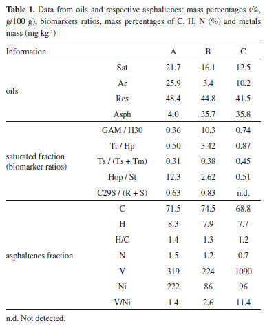 RESULTS AND DISCUSSION Compositional characterization of the samples The mass percentage of each fraction separated from the oils as well as the elemental mass percentages in the asphaltenes fractions are presented in Table 1. All asphaltenes showed H/C ratios around 1.0, which is indicative of higher unsaturation and condensation degrees.39 Samples B and C resulted in high and similar asphaltenes and resin mass percentages, suggesting higher degree of aromaticity in comparison to sample A. In a different way, A and B asphaltenes showed higher and similar N mass percentages, and such enrichment in nitrogen compounds were observed in lacustrine oils,40 corroborating the information about their origin.