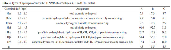 SUPPLEMENTARY MATERIAL Scanning Electron Microscopy images, Energy Dispersive Spectroscopy data and H1-NMR data for asphaltenes A, B and C are available at http://quimicanova.sbq. org.br in the form of a PDF file, with free access.