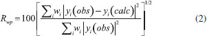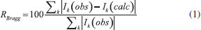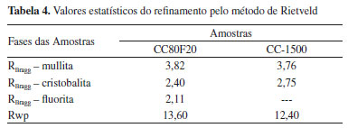 Refinamento com padrão interno Conforme o resultado de DRX, apresentados na Figura 4, as amostras CJ-1500 e CC-1500 foram as que apresentaram apenas as fases mullita e cristobalita e, portanto, uma delas (CC-1500) foi a selecionada para executar o refinamento com padrão interno, pois apresentou melhores valores de RBragg e Rwp. Na Tabela 4 são apresentados os valores dos indicadores estatísticos RBragg de cada fase presente e os fatores Rwp das amostras, obtidos no refinamento de Rietveld, através da técnica do padrão interno. As amostras são as do rejeito de caulim da região do rio Capim, calcinadas a 1500 ºC, amostra original (CC-1500) e a da mistura de 80% desse rejeito com 20% de fluorita, mistura sintética (CC80F20).