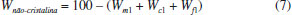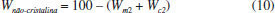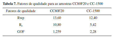 Conforme as Tabelas 5 e 6, os valores das fases mullita e cristobalita, para ambas as amostras (a original CC-1500 e a mistura sintética CC80F20), estão muito próximos um do outro, indicando que o modelo do refinamento aplicado foi ótimo e está bem adequado, pois a amostra de rejeito é a mesma, a diferença está na adição de fluorita em uma delas. Essas fases estão apresentando valores coerentes em comparação com os dados teóricos do diagrama de fases. A fração em peso (%) de fase não cristalina na mistura sintética CC80F20, (5,51%) foi convertida para a fração em peso (%) na amostra original CC-1500 resultando no valor real determinado de fase não cristalina de 6,89%, Equação 13. A Tabela 7 mostra os fatores estatísticos de qualidade do refinamento; Rwp, Re e GOF determinados pelo programa.