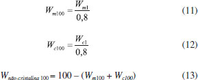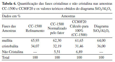 O fator de normalização (fn) em 100% CC-1500 foi utilizado para a determinação das quantidades de fases cristalinas e da não cristalina. Os valores percentuais encontrados de cada fase, bem como os teóricos máximos do diagrama de fases SiO2/Al2O3 são apresentados na Tabela 6.