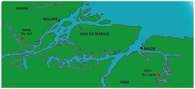 PARTE EXPERIMENTAL Os materiais utilizados no presente trabalho foram resíduos do processo de beneficiamento de caulim da região do rio Capim (CC) e do rio Jari (CJ), do estado do Pará. A Figura 1 apresenta o mapa geográfico da região onde esses rios se encontram, destacando a localização de ambas as minas onde as amostras foram coletadas.