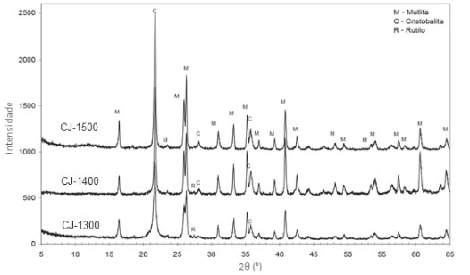 ![]() Figura 2. Difratogramas de raios X do rejeito de caulim CJ calcinado a 1300 ºC, 1400 ºC e 1500 ºC