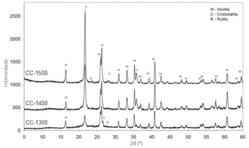 ![]() Figura 3. Difratogramas de raios X do rejeito de caulim CC calcinado a 1300 ºC, 1400 ºC e 1500 ºC