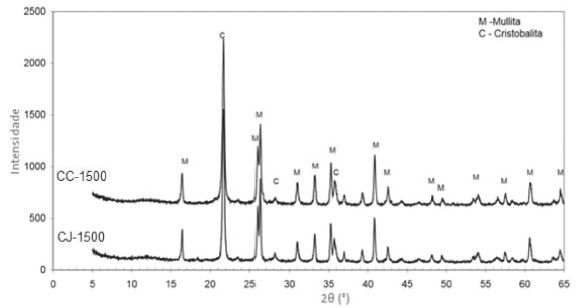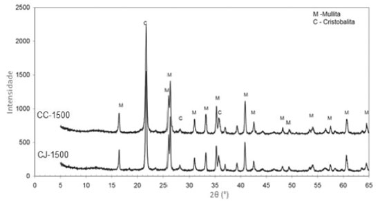 ![]() Figura 4. Comparação dos difratogramas de raios X dos rejeitos de caulim CJ e CC calcinados a 1500 ºC por 3 horas no patamar de queima