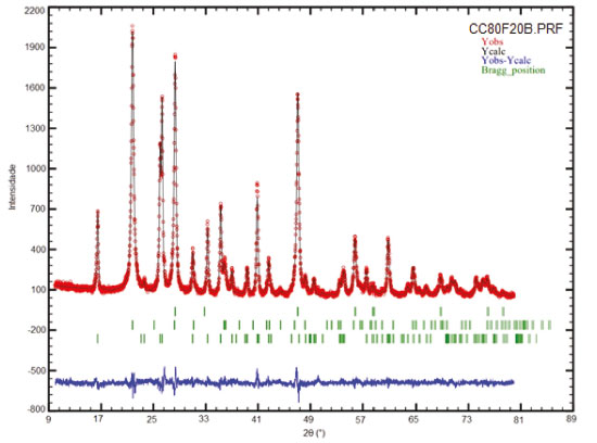 Os resultados de RBragg, (Tabela 4) são considerados muito bons; os de Rwp estão na faixa típica de refinamento utilizando a difração de raios X e, apesar de os valores de GOF estarem um pouco mais elevados que a unidade, é um valor bem aceitável, visto que ocorreram a presença de fase não cristalina e fases minoritárias. Os resultados dos fatores de qualidade numéricos podem indicar parcialmente a qualidade do ajuste, porém, também deve-se averiguar se o ajuste está ótimo pela análise visual dos perfis entre os difratogramas, mostrando se o perfil proposto pelo modelo utilizado se adequa ao perfil do difratograma experimental. Pelas Figuras 5 e 6, observam-se graficamente as características das diferenças entre o padrão calculado e o observado nas amostras CC80F20 e CC-1500, respectivamente, mostrando que o refinamento está satisfatório para ambas, analisados também pela linha da diferença entre os dados experimentais (yobs) e os do ajuste do refinamento Rietveld, (ycalc).