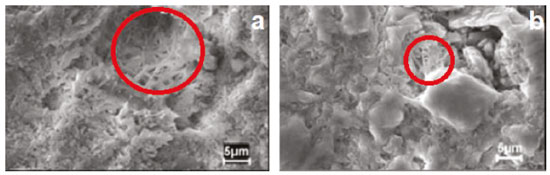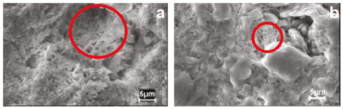 Pelos resultados obtidos da amostra, a estrutura estudada se aproxima da proporção 3:2 de mullita. Microscopia Eletrônica de Varredura (MEV) A Figura 7 (a e b) apresenta as imagens no MEV das amostras CJ e CC calcinadas a 1500 ºC, preparadas em seção polida. Comparando-as, elas apresentam, em destaque, o interior de um poro com partículas de mullita entrelaçadas, apresentando a morfologia de agulhas bem formadas. Na amostra CJ, as partículas se apresentam maiores e bem mais definidas do que na amostra CC, podendo ser justificado pelo efeito do teor de Fe (cerca de 1,5%) dentro da estrutura de CJ, como citado anteriormente.