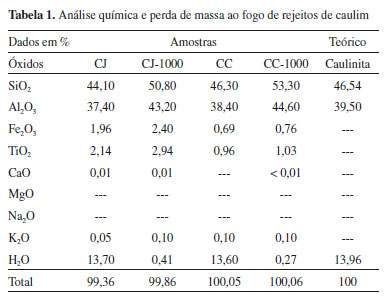 RESULTADOS E DISCUSSÃO Análise química Os resultados da análise química e da perda de massa ao fogo, de amostras de rejeitos CJ, CC estão apresentados na Tabela 1. Observa-se que os valores da perda de massa para as primeiras amostras de rejeitos e dos teores de alumina e sílica são bastante próximos aos teóricos da caulinita. A composição teórica da caulinita é de: Al2Si2O5(OH)4 (39,50% Al2O3, 46,54% SiO2, 13,96% H2O ou de perda ao fogo). Essa composição é aproximada, variando com o processo de formação da caulinita.
