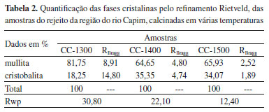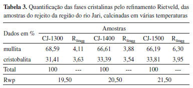Comparação dos resultados entre os resíduos Os resultados da quantificação de cada fase presente nas amostras dos rejeitos de caulins da região do rio Capim (CC) e do rio Jari (CJ), calcinados nas temperaturas elevadas, são mostrados nas Tabelas 2 e 3, respectivamente. A fase vítrea, presente nas amostras, não foi quantificada, sendo, portanto, uma comparação entre os valores das fases cristalinas, indicativos de refinamento e dos padrões dos difratogramas de cada amostra.