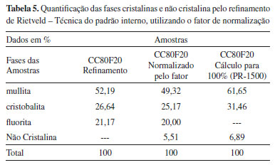 Para a amostra da mistura CC80F20, os valores dos indicativos RBragg de todas as fases são considerados muito bons, atestando, assim, que o refinamento foi satisfatório. A amostra CC-1500 (sem a adição de fluorita) apresenta ótimos resultados dos indicativos RBragg e bem semelhantes ao da mistura CC80F20, o que indica que o refinamento foi adequado. Os valores de Rwp das duas amostras estão dentro da faixa aceitável (10% a 20%), segundo a literatura. Na Tabela 5 estão contidos os resultados da quantificação de cada fase presente na amostra CC80F20. Através do resultado do refinamento da amostra com a mistura do padrão interno (CC80F20), pode-se calcular o valor da fase vítrea e utilizá-lo na quantificação das fases da amostra CC-1500. Esse cálculo foi feito pela quantidade de fluorita encontrada pelo refinamento da amostra CC80F20 (21,17%) e determinação do fator de normalização em relação a quantidade de fluorita (20,00%) acrescentada na amostra original.