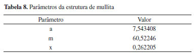 Modelos estruturais Partindo dos resultados obtidos pelo programa FullProf, utilizando o parâmetro de rede "a", para estrutura de mullita, nas Equações 14 e 15, calcularam-se os valores de "m" e "x", dispostos na Tabela 8.