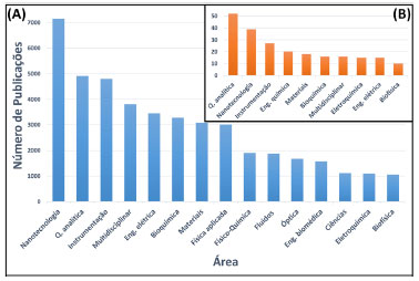 ![]() Figura 1. Distribuição do número de publicações envolvendo microfluídica nas principais áreas correlatas considerando (A) o quantitativo total extraído da Web of Science bem como (B) o quantitativo com autoria de pesquisadores brasileiros. Dados extraídos do banco de dados da "Web of Science", em 30/07/2020, usando "microfluidics" como palavra-chave de busca