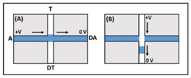 MODOS DE INJEÇÃO DE AMOSTRA A miniaturização dos sistemas eletroforéticos apresenta como um dos seus grandes desafios o controle da quantidade de amostra injetada, uma vez que esse afeta diretamente a reprodutibilidade e, consequentemente, a confiabilidade das separações nos MSE.75 Assim como nos sistemas eletroforéticos convencionais,44 a introdução da amostra nos MSE pode ser realizada através de processos eletrocinéticos ou hidrodinâmicos.16 Os dois modos de introdução da amostra apresentam peculiaridades, as quais serão discutidas separadamente. Injeção eletrocinética A injeção eletrocinética tem como principal vantagem a sua praticidade instrumental. Nesse tipo de abordagem, a fonte de alta tensão utilizada para aplicação do potencial elétrico, necessário para a separação eletroforética dos analitos, pode ser também usada para promover a injeção da amostra. Deste modo, o controle dos potenciais elétricos é fundamental para a definição do volume de amostra injetado.16,76 Esse tipo de injeção é favorecido quando o fluxo eletrosmótico (FEO) possui a mesma direção da migração dos analitos. Em geral, considerando um sistema convencional de eletroforese capilar, por exemplo, os analitos com mesma carga do potencial aplicado migram no canal em direção ao detector e a quantidade injetada pode ser calculada pela seguinte equação:77 ![]() sendo, µe a mobilidade eletroforética, µFEO a mobilidade do fluxo eletrosmótico, r o raio do capilar, V a voltagem aplicada, ti o tempo de injeção, C a concentração do analito e L o comprimento total do capilar. Desse modo, a quantidade de amostra injetada depende da mobilidade eletroforética de cada analito. Nos sistemas miniaturizados, a quantidade de amostra introduzida no interior dos microcanais não pode ser calculada de maneira análoga aos capilares. Isso ocorre devido às diferenças geométricas bem como no controle dos potenciais aplicados. Além disso, a introdução da amostra pode ser feita baseando-se na difusão da amostra. Nos MSE, três modos eletrocinéticos, denominados como floating, pinched e gated, podem ser utilizados para promover a injeção da amostra. Cada um deles requer definição prévia da geometria do MSE bem como do número de canais disponíveis para aplicação de potenciais elétricos independentes na fonte de alta tensão.78 Modo floating Dentre as modalidades eletrocinéticas, o modo floating, também denominado de unpinched, é, do ponto de vista instrumental, o procedimento mais simples para injeção da amostra nos MSE. Isso se justifica pelo fato de o protocolo exigir apenas uma fonte de alta tensão monocanal.76 A Figura 2 mostra um esquema do controle eletrocinético para as etapas de injeção e separação em MSE definidos na configuração de cruz, contendo um canal de injeção (ou amostragem), delimitado pelos reservatórios da amostra (A) e descarte da amostra (DA), e um canal de separação, delimitado pelos reservatórios do tampão (T) e descarte do tampão (DT). Essa geometria é uma das mais utilizadas nos MSE.
