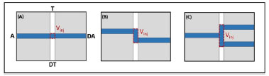 ![]() Figura 3. Representação da intersecção dos canais nos arranjos em cruz (A), duplo-T (B) ou triplo-T (C) para definição geométrica do volume de injeção (Vinj). Outras informações: ver Figura 2