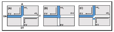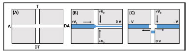 Em comparação ao modo floating, a quantidade de amostra introduzida nos canais de separação depende majoritariamente das forças eletrocinéticas, não tendo influência do tempo de confinamento ou da geometria do canal.16,76,79 Alarie e colaboradores realizaram um estudo fundamental avaliando o efeito do campo elétrico aplicado no modo pinched e suas implicações no comprimento da zona de amostra formado.82 Em geral, os autores demonstraram que quanto maior a intensidade do potencial elétrico aplicado em V2 e V3 (ver Figura 4B), por exemplo, menor o volume de amostra injetado no interior do canal e, consequentemente, maior a eficiência de separação. O trabalho reportado pelos autores permite uma avaliação das condições electrocinéticas visando maximizar a eficiência de separação e manter um bom equilíbrio com os níveis de detectabilidade. Modo gated O modo de introdução da amostra conhecido como gated se baseia em um protocolo em que o tempo de difusão da amostra define o volume de injeção a ser introduzido no interior do canal de separação.76 Nesse processo, se faz necessário a aplicação, concomitantemente, de potenciais elétricos em dois canais microfluídicos. Para preencher o canal de amostragem, aplica-se uma diferença de potencial (+V1) no canal definido entre os reservatórios A e DA. Simultaneamente, é estabelecida uma diferença de potencial (+V2) no canal definido entre os reservatórios T e DT. Nessa etapa, o transporte eletrocinético promove o preenchimento dos canais com as respectivas soluções, conforme visualizado na Figura 5A. Para a formação do plug de amostra, o potencial aplicado no reservatório T é desligado por um curto intervalo de tempo (tipicamente entre 1 e 5 s), permitindo a difusão da amostra para o interior do canal de separação (Figura 5B). Ao reestabelecer o potencial aplicado inicialmente, um volume de amostra definido pelo tempo de difusão é então introduzido no canal de separação (Figura 5C). Em seguida, a separação eletroforética ocorre normalmente e as espécies são usualmente detectadas no final do canal de separação.85-87 Nessa metodologia, o volume de amostra introduzido no canal de separação depende diretamente do tempo de injeção e da magnitude do campo elétrico aplicado.14