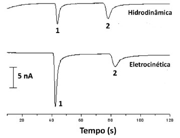 ![]() Figura 6. Eletroferogramas comparando o desempenho dos modos hidrodinâmico e eletrocinético para injeção de uma amostra modelo contendo (1) dopamina e (2) catecol (500 μmol L-1 cada). Figura adaptada e reimpressa da referência 99, com permissão