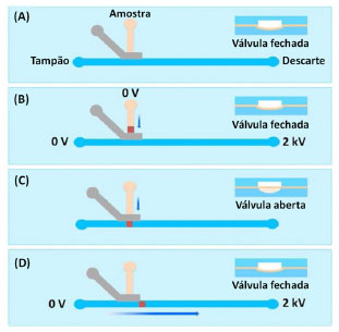 ![]() Figura 8. Demonstração do acoplamento de válvulas microfabricadas aos microssistemas eletroforéticos para permitir a pré-concentração eletrocinética da amostra antes da etapa de injeção hidrodinâmica. Figura adaptada e reimpressa da referência 107, com permissão