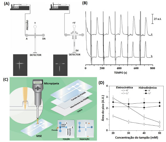 ![]() Figura 9. Representação de injetores hidrodinâmicos alternativos para MSE incluindo o uso de bombas seringas e micropipetas eletrônicas. (A) Acoplamento de bomba seringa a um MSE. (B) Eletroferogramas mostrando a análise de catecol através da injeção hidrodinâmica e injeção eletrocinética. (C) Acoplamento de uma micropipeta eletrônica a um canal auxiliar em um MSE híbrido composto de PDMS/vidro. (D) Variação da área de pico em função da concentração do tampão utilizado no procedimento eletroforético adotado durante a injeção hidrodinâmica e injeção eletrocinética. Figuras adaptadas e reimpressas das referências 97 e 100, com permissão