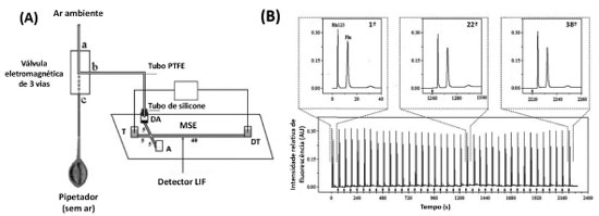 ![]() Figura 10. Representação do uso de um pipetador manual conectado a uma válvula eletromagnética de 3 vias como injetor para MSE e eletroferogramas resultantes mostrando uma série de 38 injeções sequenciais de uma amostra modelo contendo rodamina e fluoresceína. Figura adaptada e reimpressa da referência 108, com permissão