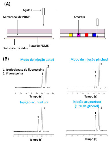![]() Figura 11. (A) Injetor hidrodinâmico para MSE baseado no uso de uma agulha de acupuntura e (B) eletroferogramas mostrando a separação de uma mistura contendo fluoresceína e isotiocianato de fluoresceína introduzida no interior dos microcanais com a agulha e por meio dos modos eletrocinéticos conhecidos como "gated" e "pinched". Figura adaptada e reimpressa da referência 101, com permissão