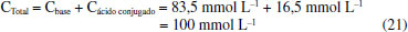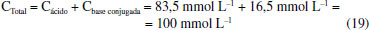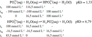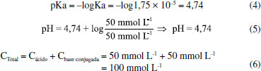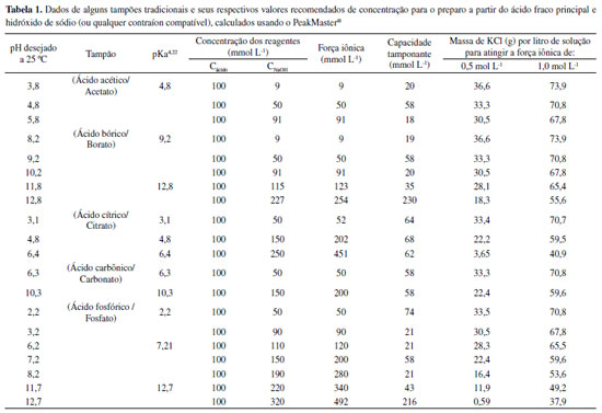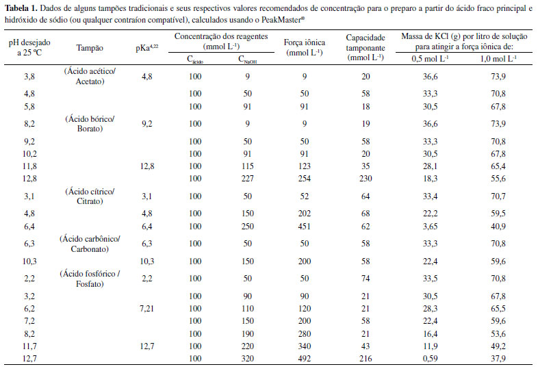 Na Tabela 1 são listados alguns outros exemplos de tampões tradicionais e seus respectivos valores recomendados de concentração para o preparo a partir do ácido fraco principal e hidróxido de sódio (ou qualquer contraíon compatível), calculados usando o PeakMaster®. São apresentados, ainda, os valores de força iônica, capacidade tamponante, além da massa de KCl a ser adicionada para ajuste de força iônica nos valores de 0,5 mol L-1 e 1 mol L-1.
