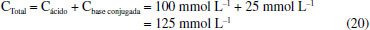 Vale lembrar que, neste exemplo o tampão foi estabelecido após o deslocamento de equilíbrio do ácido fosfórico até o equilibrio correspondente ao tampão em questão, conforme o esquema: ![]() No exemplo, a concentração total da solução tampão é de 100 mmol L-1, conforme os cálculos da expressão 19: ![]() Caso seja necessário preparar uma solução com concentração total menor ou maior, basta ajustar os valores da concentração de cada um dos reagentes, desde que seja mantido a mesma proporção. Esses cálculos também podem ser realizados e/ou conferidos inserindo os novos valores de concentração no PeakMaster® e acompanhando a resposta gerada. A partir dos dihidrogenofosfato e hidrogenofosfato de sódio Por esse procedimento, temos que a proporção necessária para o preparo seria de, por exemplo, uma massa de dihidrogenofosfato de sódio correspondente a um solução 100 mmol L-1 e de uma massa de hidrogenofosfato de sódio correspondente a uma solução 25 mmol L-1 para obtenção de um tampão (NaH2PO4/Na2HPO4) com concentração total de 125 mmol L-1 e pH 6,5, de acordo com os resultados calculados pelo PeakMaster®, conforme apresentado na Figura 5.